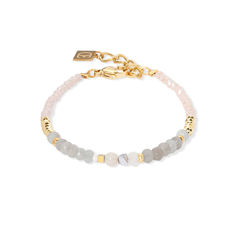 PULSERA ACERO AMULET CUARZOS ROSAS Y GRISES CHAPADO ORO