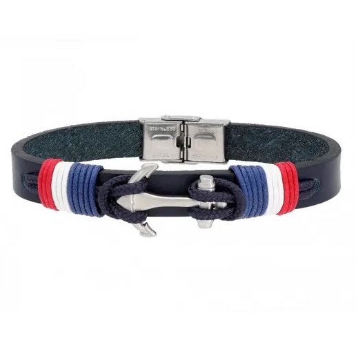 PULSERA ACERO Y PIEL AZUL CON ANCLA Y DECORACIONES AZUL-BLANCO Y ROJO